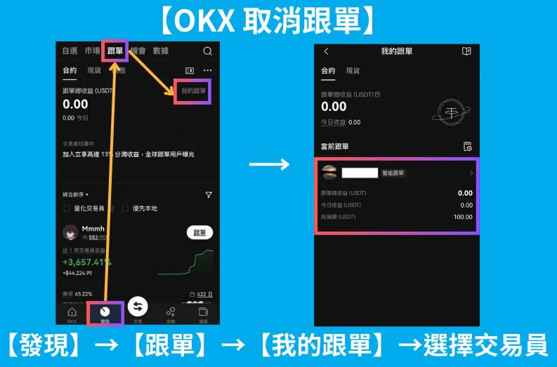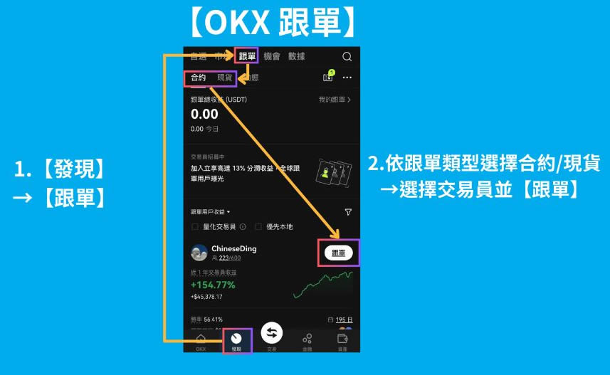 依跟单类型选择合约现货/跟单→选择带单员并【跟单】