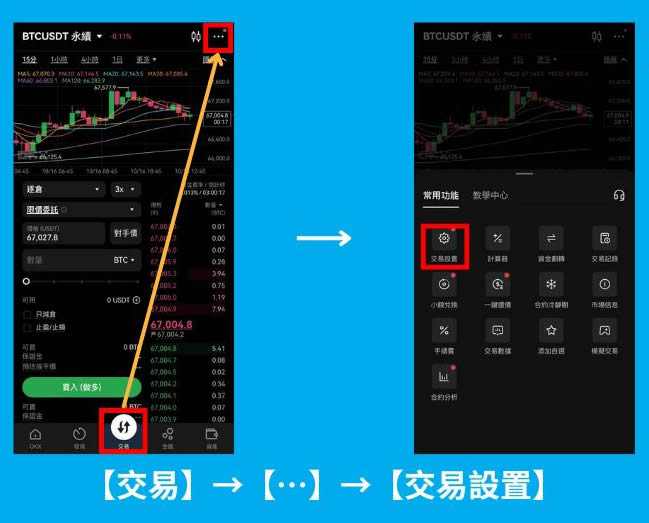 【交易】→【…】→【交易设置】→【仓位模式】→【双向持仓】