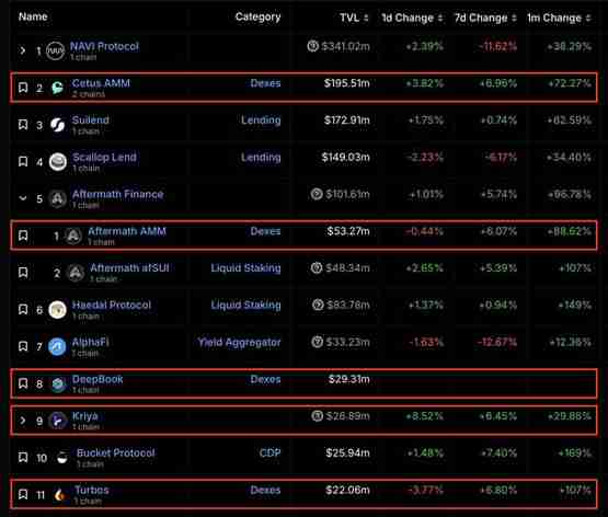 根据DefiLlama,Sui锁仓价值最高的DEXs分别为Cetus(1.95亿美元)、After Math(5,327万美元)、DeepBook(2,931万美元)、Kriya(2,689万美元)和Turbos(2,206万美元)。除了DeepBook之外,这些DEXs皆使用典型的AMM(Automated Market Maker)或CLMM(Concentrated Liquidity Market Maker)机制,即参与者提供流动性(Liquidity Pools,LP)、协议以X*Y=K公式计算(X和Y分别为LP里的两种代币数量,K=固定乘积)即时代币价格。随着DeepBook与DEXs的流动性整合,DeFi使用者将能通过熟悉的限价挂单,买卖Sui链上的各式代币。
