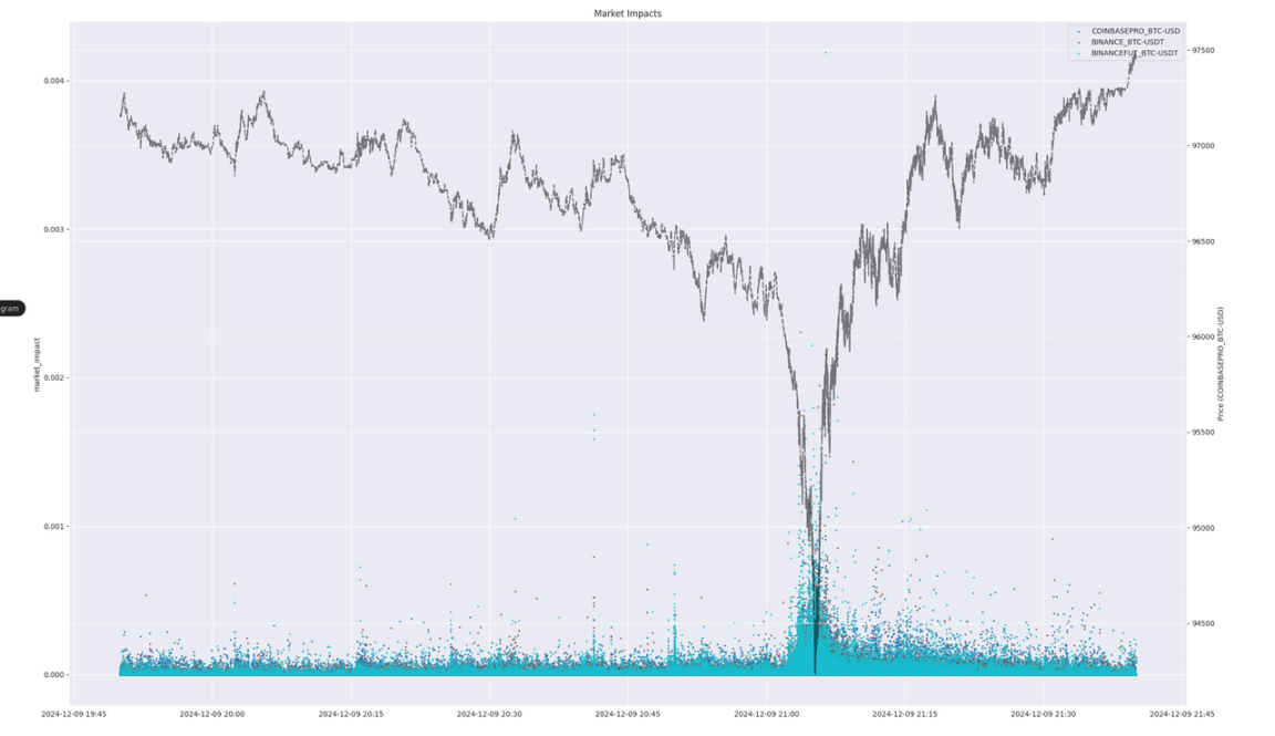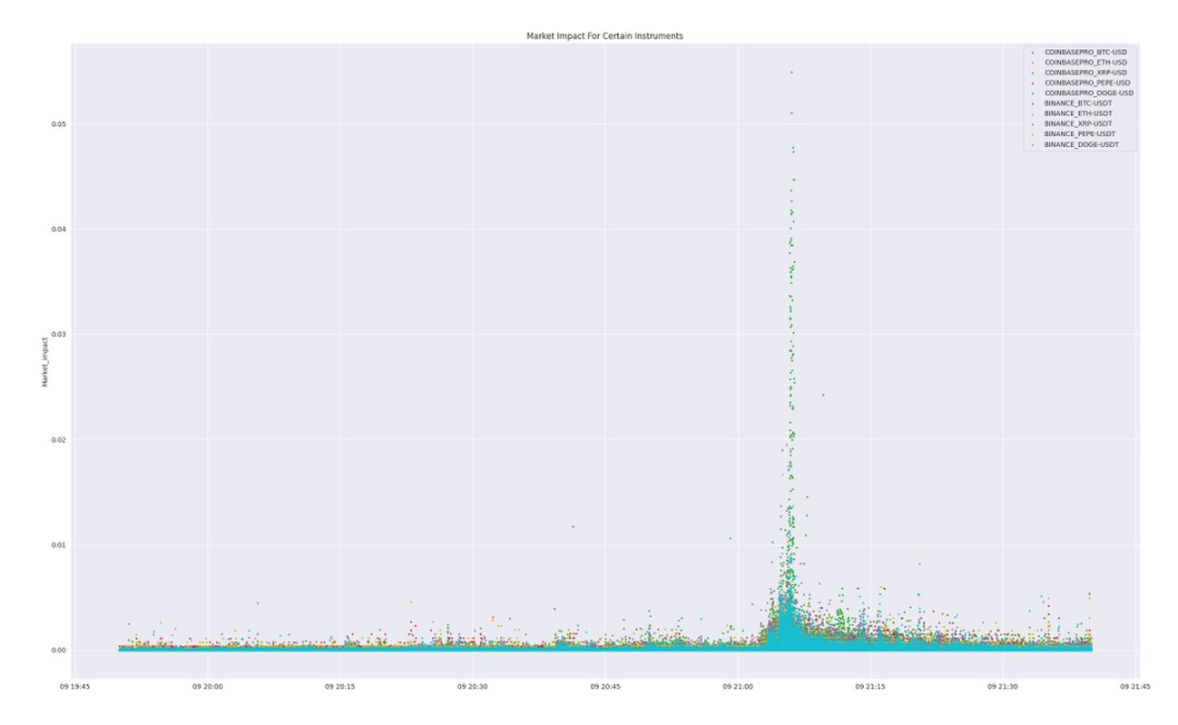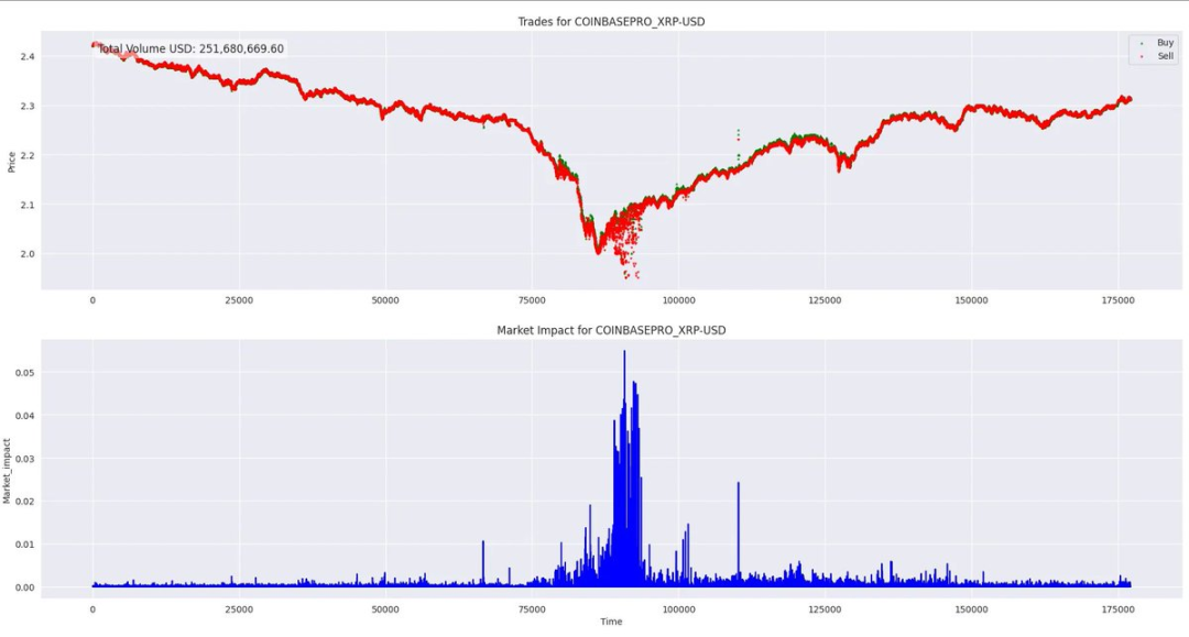 我个人非常喜欢分析市场影响。如果我只能专注于市场中的一个特征,那一定是市场影响。在这里,你会看到一些令人震惊的事情——Coinbase 上 XRP 的市场影响相当大。