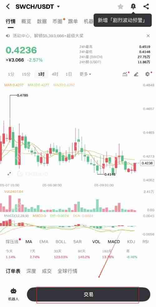 2.然后点击Gate.io APP内的搜索框,搜索SWCH币,选择SWCH/USDT,这样就会进入它的详细页面,就可以看到该币种的交易信息以及市场信息,点击右下角的交易