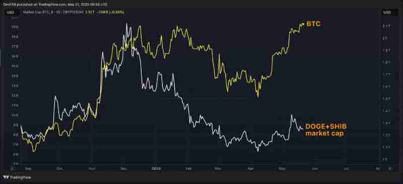 但目前并未出现类似迹象,DOGE 与 SHIB 的总市值仍远低于 1 月的高点。