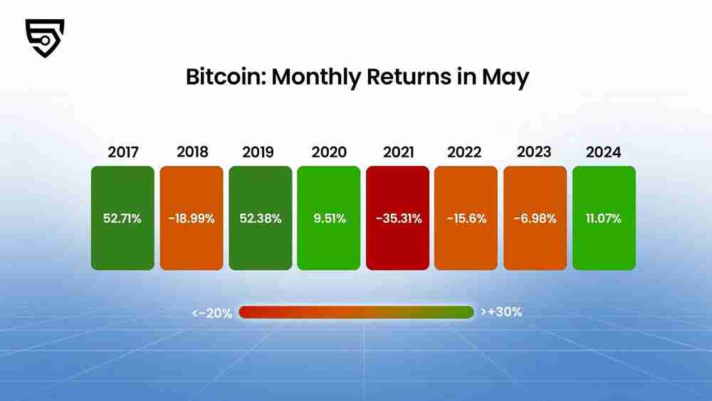 下图是2017到2024每年5月份比特币的月度表现。