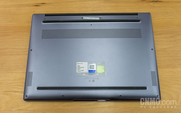 最后是机身的D面,可以看到,机器的背面设计非常规整,设计感十足。中间的一长条开孔是散热孔,主要是用来给机器散热使用的;下面两个对称的开孔是扬声器开孔,由于支持杜比全景声,MateBook 14的外放表现也是可圈可点,看剧时的临场感很不错;两条橡胶材质的长条对称分布于机器背面的顶部和底部,其一方面是用来稳固机器,另一方面是为机器散热留足空间,这个贴心的设计值得点赞。