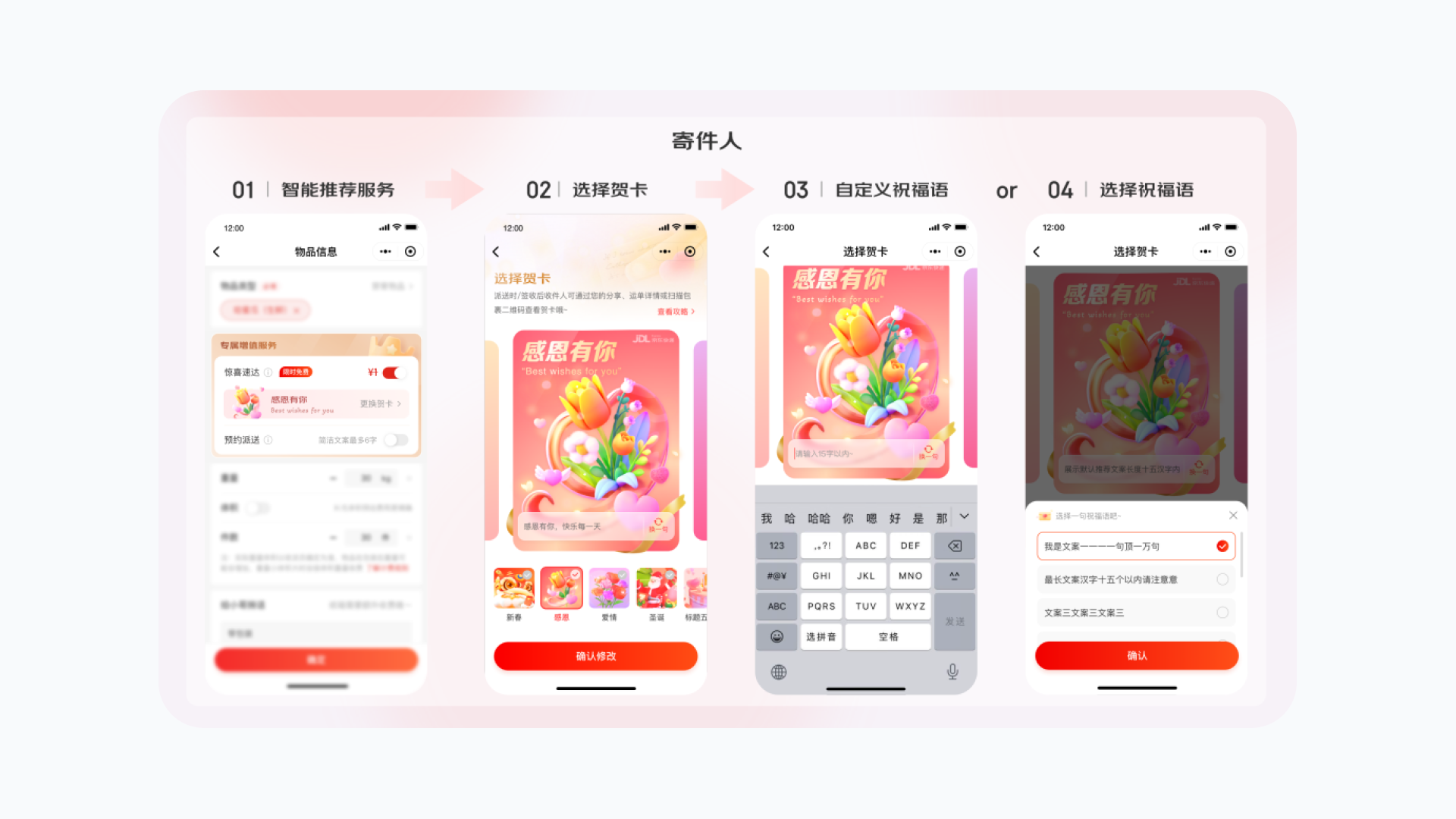 随着时间推移,节日庆祝的方式也在发生改变,人们从传统的庆祝方式出发,慢慢创造和演变出新型的庆祝方式,当下的快递服务让人们跨越了时间和空间,从面对面送礼物到不受时间和空间的限制随时随地的表达庆祝,所以菜鸟可以在下单业务中,考虑京东快递惊喜达的交互,增加节日卡片营造仪式感。并且,通过寄件人和收件人的角度,全流程的触达仪式感的打造,提升产品惊喜感,赋能业务增长,助力营销传播。