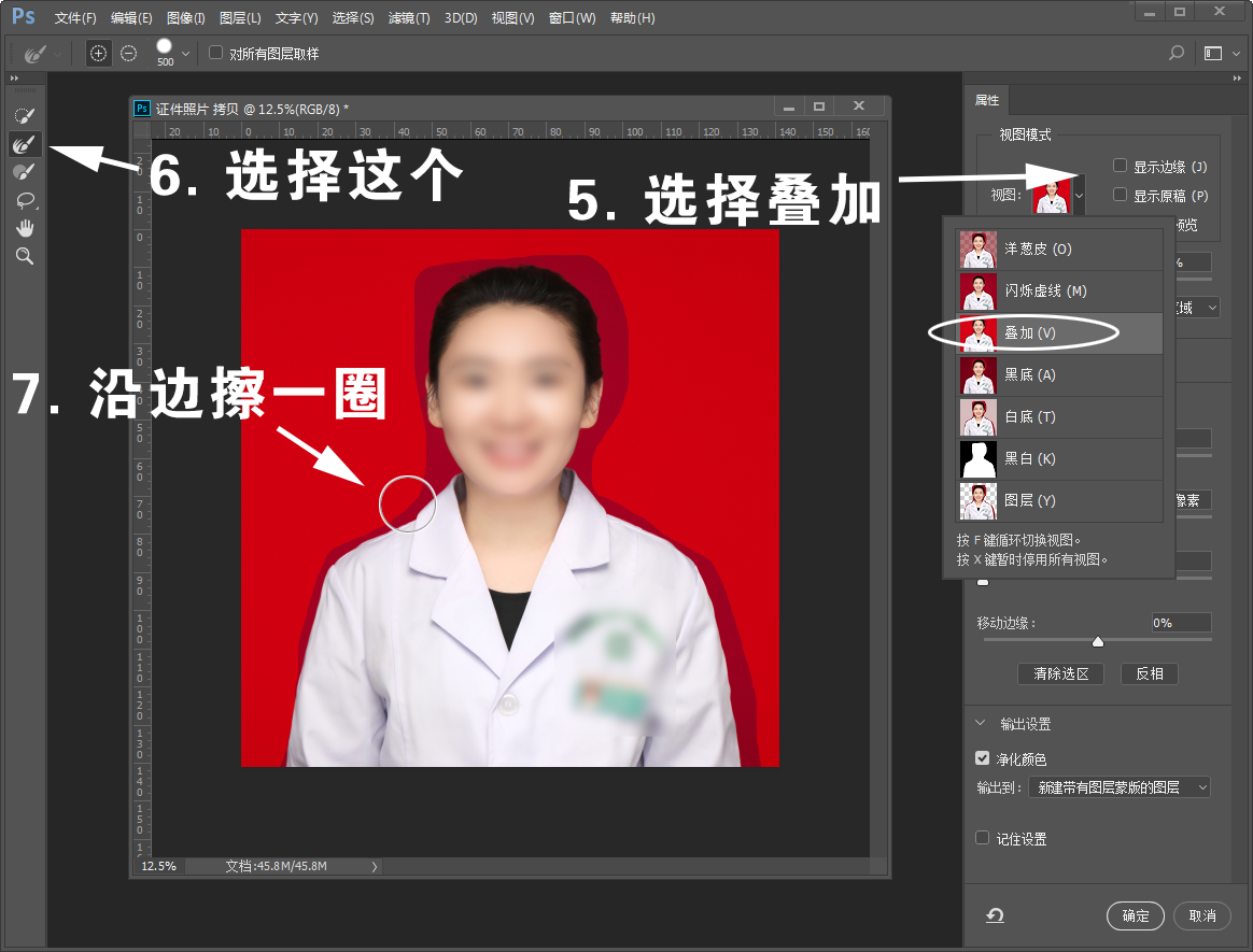 第三步:选择“叠加”,用第二个“调整边缘画笔工具”沿着人物在边缘擦一圈,把要去掉的背景擦掉,可以用键盘上的“【” 和 “】”来调整画笔的大小。以便更精确地抹除多余的部分。