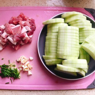 1、切好所有材料 后腿肉切片 蒜切片 小葱切小段 胡瓜对半切后切厚片