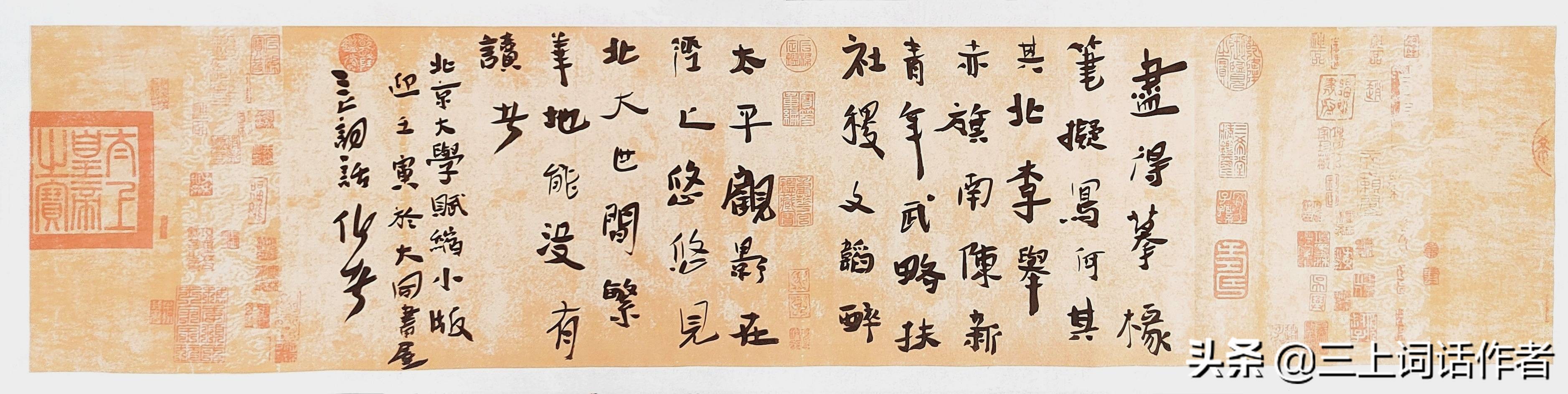 于是壬子孟夏,【即1912年5月15日(农历三月廿九)。】北京大学冠名而国立,【称谓,即国立北京大学。】听蒸汽笛鸣催发,【蒸汽笛鸣:火车的诞生和施用。1804年,由英国的矿山技师德里维斯克利用瓦特的蒸汽机造出了世界上第一台蒸汽机车,时速为5至6公里。因为当时使用煤炭或木柴做燃料,所以人们都叫它“火车”,于是一直沿用至今。催发:比喻词。催促出发。[宋]柳永《雨霖铃》词:“都门帐饮无绪,留恋处、兰舟催发。”】戒醉骑逍遥之类。【戒:《说文解字·廾部》:“戒,警也。”《荀子·儒效》:“家富而愈俭,胜敌而愈戒。”这里指改变旧习。醉骑逍遥之类:诸如改变乘用牛车、羊车等习惯。比喻摒弃落后的东西。】倡研究高深学问,【蔡元培先生在就任北京大学校长时发表就职演说时, 讲述大学精神之一为“抱定宗旨”。指出大学的性质“大学者,研究高深学问也。”】做科学救国之事。【中国近代科学的奠基人之一,著名学者、教育家和思想家任鸿隽曾提出“科学救国之事”的话,亦可谓是“科学救国”的先驱。】“循思想自由原则,取兼容并包之义”。【教育家蔡元培先生提出的学术主张和办学方针,强调不论何种学派,“苟其言之成理,持之有故,尚不达自然淘汰之命运者,虽彼此相反,而悉听其自由发展。”(《致“公言报”函并附答林琴南君函》) [引证]所谓寸有所长,尺有所短。“思想自由”是挖掘潜力和启迪智慧的思维方式,“兼容并包”是兼纳和开明的行为做法。关键是稀罕长(cháng)者,长(zhǎng)者包容,凡有所望,我必育之;凡有所长,我必用之;凡有作为,我必有之。】开选科以文理,【文理:即所实行的一种教育制度,即将教学分为文科和理科,采取分别教育的方式。】分学科于专精;【按照学问的性质,依据学术的性质而划分的科学门类,精通所学科目。】尊格物以致知,【格物致知:“物格而后知至,知至而后意诚,意诚而后心正,心正而后身修,身修而后家齐,家齐而后国治,国治而后天下平。”([西汉]戴圣《礼记·大学》)后人由“致知在格物,物格而后知至”引申出成语“格物致知”。格:推究;致:求得。穷究事物原理,从而获得知识。[引证] 格物致知,指的是一种实践精神,从而证明的是一种学贵力行,行贵体悟,行而致知,知而促行,循序渐进,方能诚意正心。只有培育修齐治平品格,才能造就经世致用人才。】悟知来于忽焉。【知来:“见出以知入,观往以知来。”(《列子·说符》)即看见外表就可以知道内里,观察过往就可以预知未来。忽焉:快速貌。《论语》:“颜渊喟然叹曰:‘仰之弥高,钻之弥坚,瞻之在前,忽焉在后。’”[引证] 没有无缘无故的天之骄子,只有充分准备的厚积薄发。】妙万物以达观,【达观:泛指畅通,谓心胸开朗,见解通达。出自《尚书·召诰》:“ 周公朝至于洛 ,则达观于新邑营。” [晋]陆云《愁霖赋》:“考幽明于人神兮,妙万物以达观。” [引证]此偏向遍览、纵观之意多矣。《魏书·阳尼传》:“彼八方之局促兮,殊无可以达观。”】纵浪大于化中;【[晋]陶渊明《形影神三首》之“神释”:“纵浪大化中,不喜亦不惧。”[引证]顺应自然,以达观的态度看待一切事物变化。】秉道法以自然,通大道于方圆。【道法自然是老子学说的精髓,出自《道德经》第二十五章:“人法地,地法天,天法道,道法自然。”故与“通大道于方圆”句,联系起来理解,方可通达。《管子·形势解》:“以规矩为方圜则成,以尺寸量长短则得。” [引证]方圆是事物的形体、性状,行为和规范是处世之道与做人之本。】涉四海以潮涌,踩坚船于属意;【跨海洋时记坚船的厉害,即鸦片战争,1840年(道光二十年),英国政府以林则徐的虎门销烟等为借口,决定派出远征军侵华。[引证]属意:意向集中或倾向于某人或某事。踩坚船于属意:泛指踩上坚船出海时,时刻想着有着属于我们同样的坚船,于是才有为中华民族而读书的决心。】告八荒以奋蹄,晓利炮于国安。【教化民众,启发自觉,国力不强,军力不强,就会被动挨打。牢记1840年,船坚炮利的英国海军沿着广州一路北上,打到天津,经过多次的交火和清政府的懦弱协商,中英签订《南京条约》。[引证] 说明“告八荒以奋蹄”的迫切与及时。八荒:泛指周围、各地。四面八方遥远的地方,犹称“天下”。如《汉书·项籍传赞》:“并吞八荒之心。”颜师古注:“八荒,八方荒忽极远之地也。” 晓利炮于国安:指读书为国强,时刻准备着催告有着属于自己的利炮,才能拒敌于千里之外。】取法典于启智,寓法理以通义;【喻京师大学堂首设“法律学门”,开中国近现代大学法律专门教育之先河,启蒙法治思想。法理:法律的理论依据。《东观汉记·张禹传》:“明帝以其明达法理,有张释之风,超迁非次,拜廷尉。”又《隋书·裴蕴传》:“蕴亦机辩,所论法理,言若悬河,或重或轻,皆由其口,剖析明敏,时人不能致诘。”又,李大钊《国情》:“以新约法为物,无吾侪管窥法理之馀地。”通义:释义为普遍适用的义理;疏通大义。《孟子·滕文公上》:“治于人者食人,治人者食于人,天下之通义也。”又《汉书·卷三十六·楚元王刘交传》:“天地之常经,古今之通义也。”】信辣手以著文,担道义于铁肩。【明代大臣杨继盛有“铁肩担道义,辣手著文章”联句。李大钊有“铁肩担道义,妙手著文章”语。[引证]“道义”是义理;“妙手”是方法;“文章”是立说;