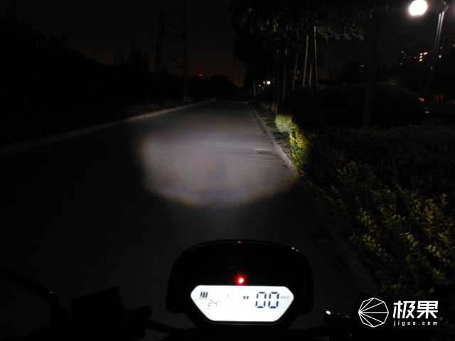 开启远光的效果,远光灯的照射范围明显大于近光灯。