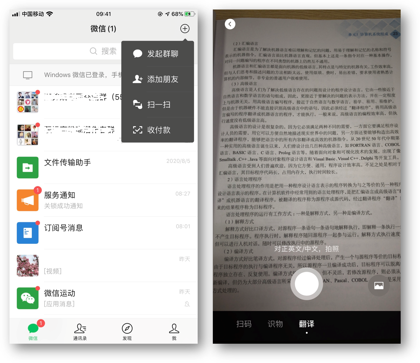 首先我们打开微信,在消息列表界面,点击右上角的加号,选择扫一扫功能,然后切换到翻译功能,将相机对准纸质文档,并按下快门键。