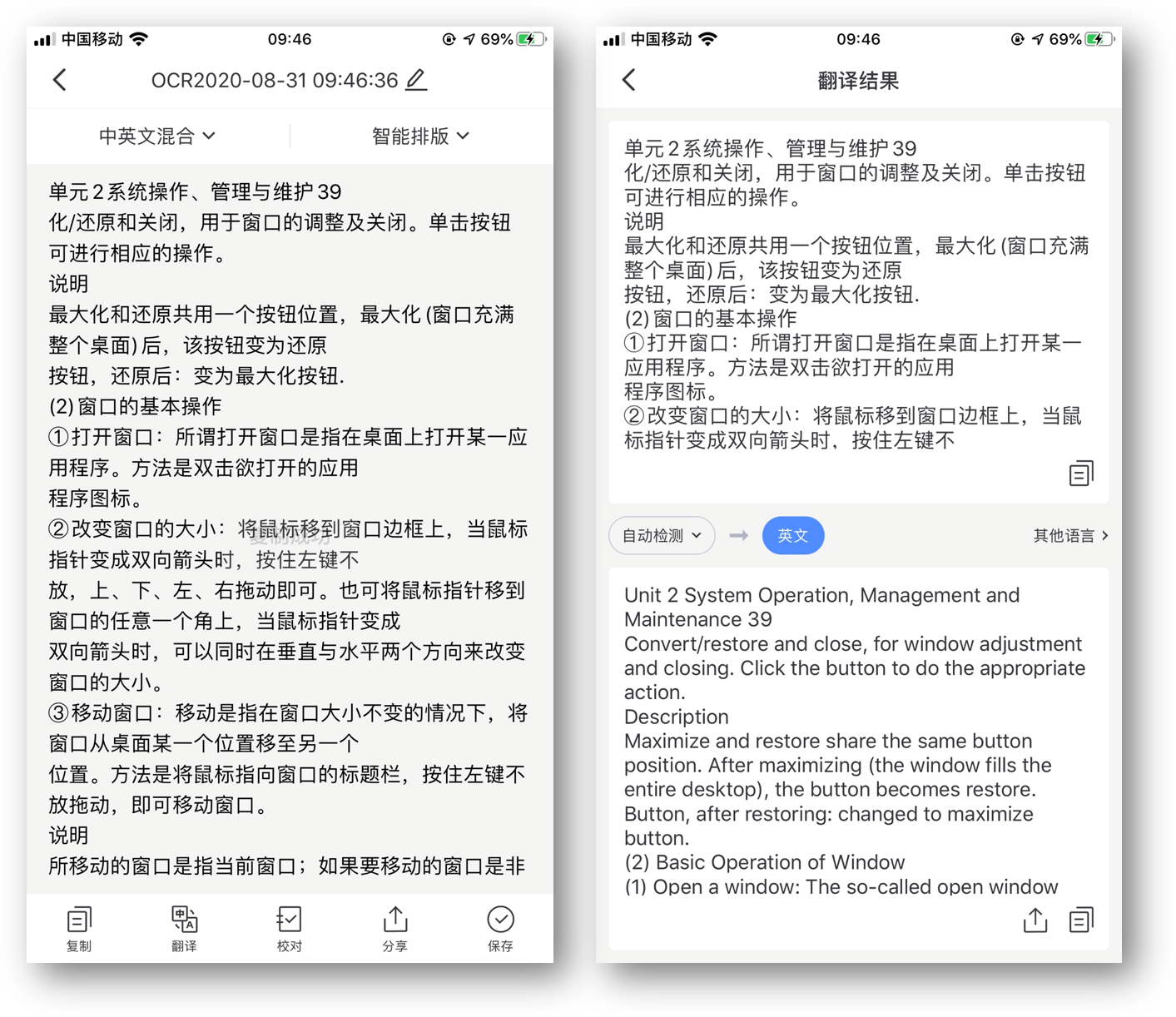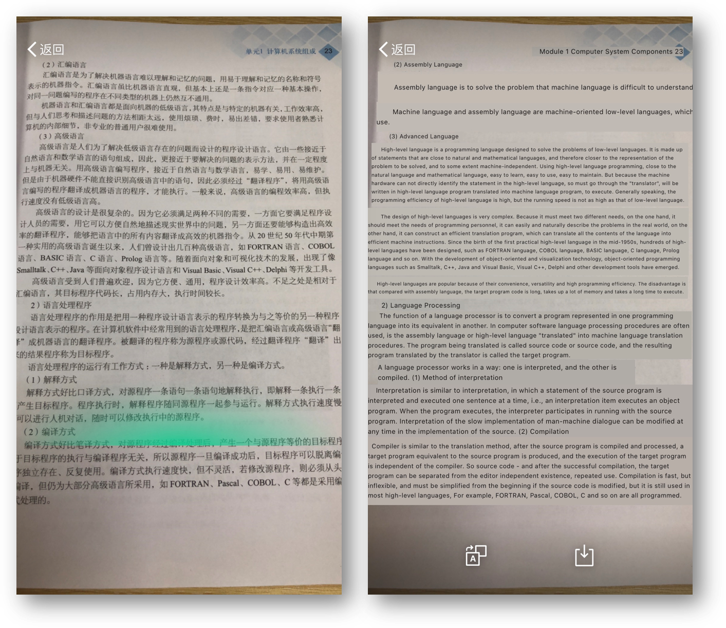 接下来会自动扫描拍下的文档,最后我们将会看到,纸上的文字被翻译出来了,底部有两个按钮,一个是中英文切换,一个是保存到相册中。