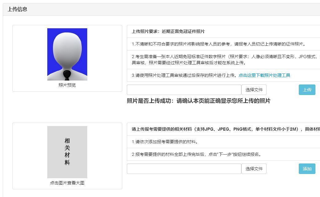 1、考生需准备一张本人近期免冠标准证件数字照片(照片要求:人像必须清晰且不变形,JPG格式,红、蓝或白色背景,文件大于30k,照片像素大于300*215)用于照片处理工具审核,照片需要经过照片处理工具审核后才能在系统上传。
