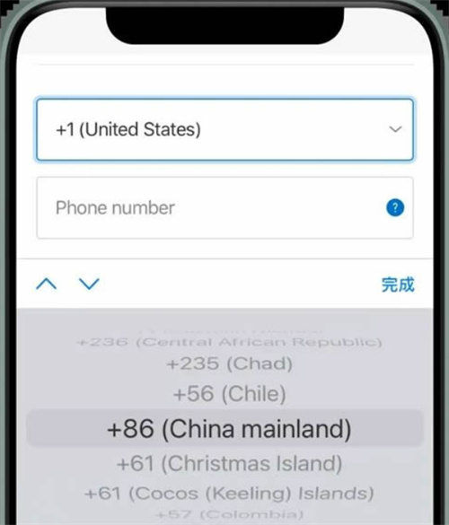4、设置手机号。在下拉菜单中选择您所在的国家/地区,然后输入您的手机号码即可收到短信验证码。例:中国大陆号码选择“ 86中国大陆”选项。