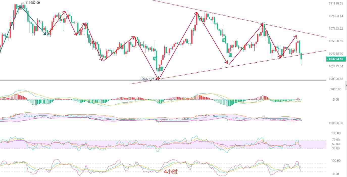 四小时K线显示,连续两根大阴线跌破EMA趋势指标,EMA向下交替扩散的趋势结束。MACD指标开始缩量,DIF和DEA金叉被扭转,形成死叉。布林带虚破上轨105850美元后,出现跳水行情,直接跌穿下轨支撑103500美元,空头动能初步释放,但尚未完全结束。关注上方104000美元的上升趋势压力位,未持有空单的投资者可将其作为参考。