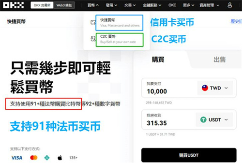 okx的买币渠道分为两种:①信用卡买币;②C2C买币;信用卡买币是直接和交易所购买,而C2C买币是和入驻OKX的兑换商购买,是买家和卖家一对一的交易。