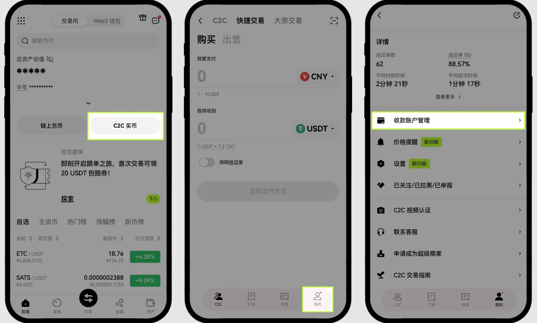 在 C2C 交易中,付款时必须使用与本人实名信息一致的账户进行支付。收款时普通用户必须使用本人实名账户收款;认证商家允许使用非实名账户收款。