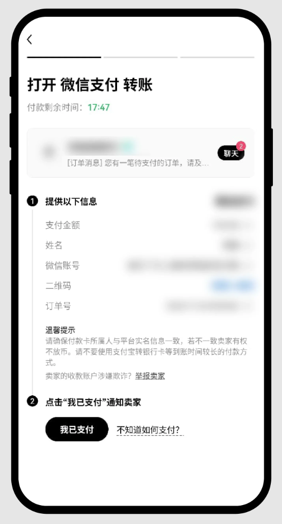 4. 一定要以订单详情页里展示的收付款方式或者 IM 窗口卖家推送的卡片信息内的收付款方式为准,切勿转错。