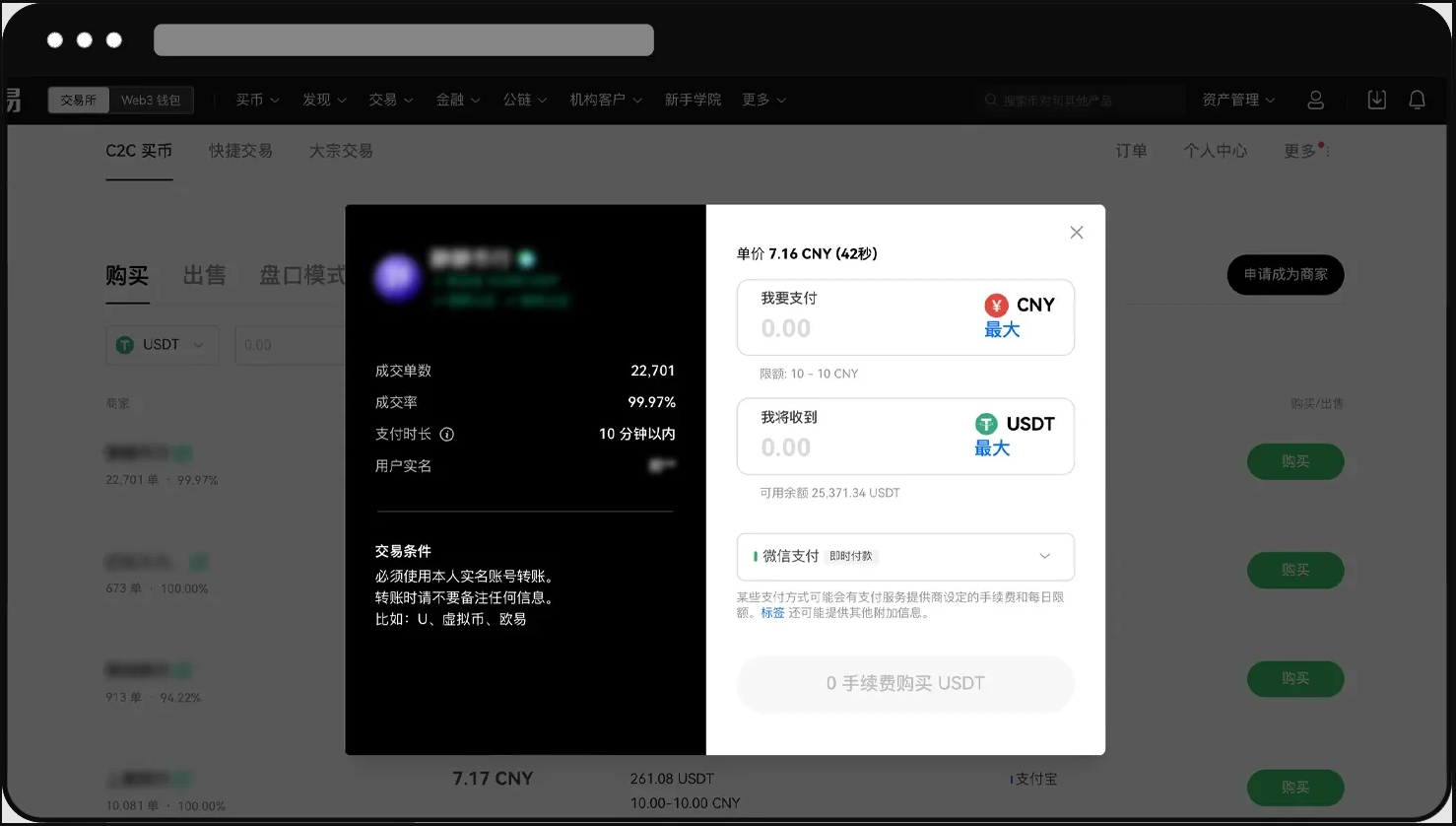 1. 打开官网,点击【买币】-【C2C 买币】-【C2C】-【购买】,选择可交易的商家进行购买