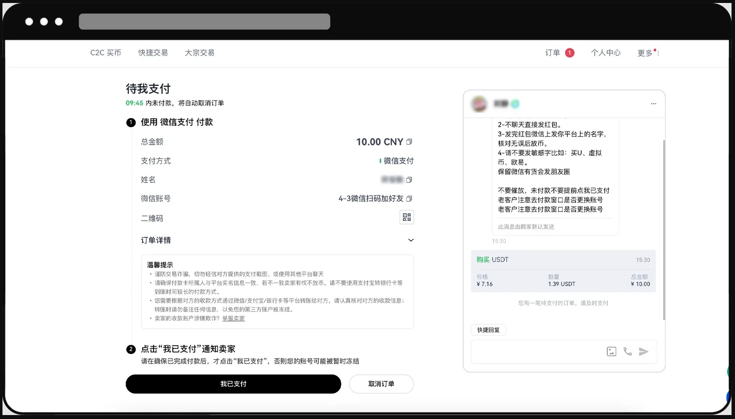 一些诈 骗犯会利用第三方支付平台的退款功能,在 C2C 交易完成后取消付款。若用户在未确认法币资金或数字资产已到账的情况下,就点击确认订单,则诈 骗犯将可以轻易撤回付款。