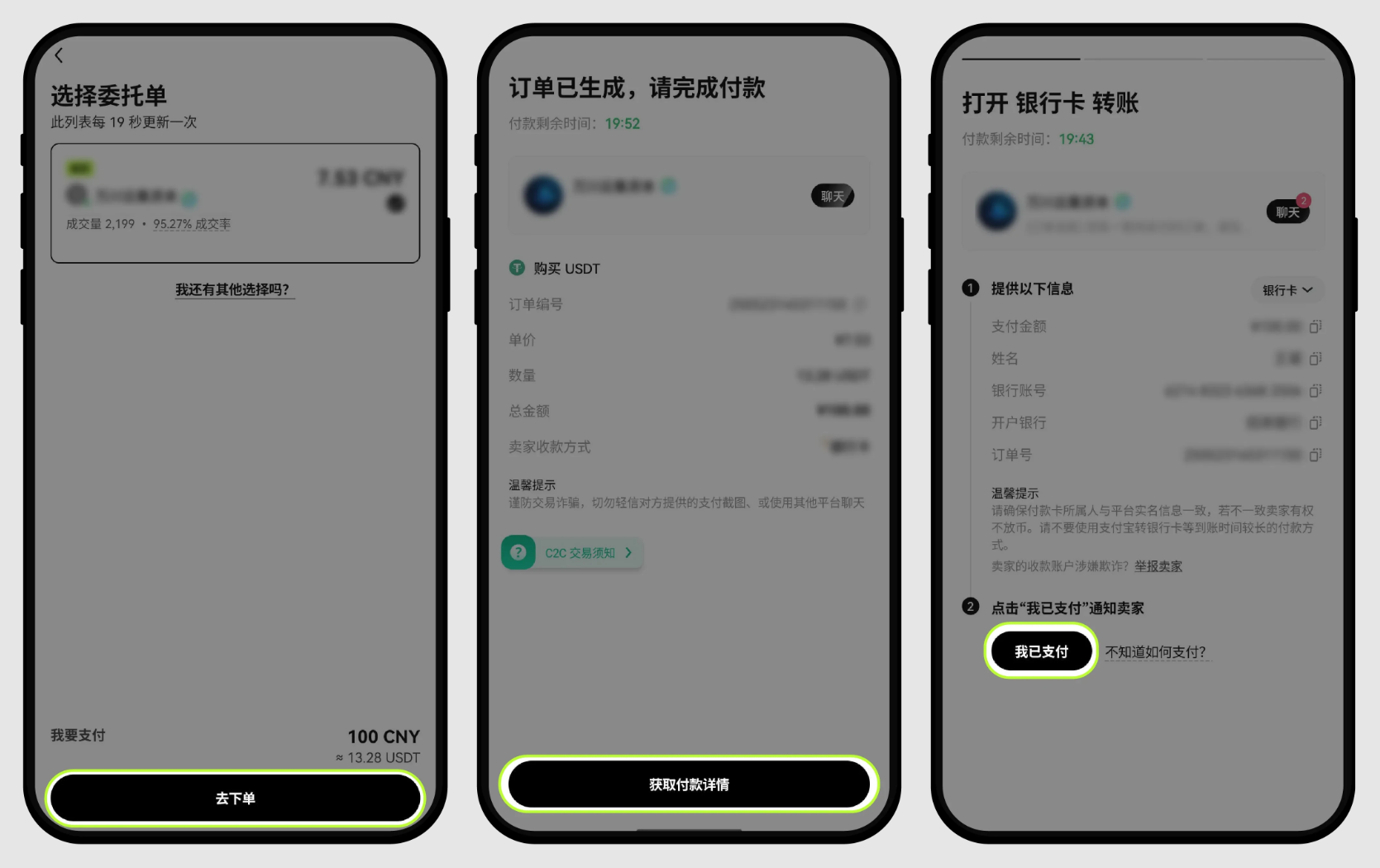 当您在使用 C2C 交易时,请确认 App 已经更新至最新版本,并已经通过身份认证,收付款银行卡必须是身份认证本人的实名银行卡。 C2C 买币可能触发 T N 安全保护机制,平台风控系统将综合评估您交易等行为,限制 1 天、3 天、或 7 天卖出及提币(具体请以页面显示为准)。如果您不想交易被锁定的买币订单,可以不选择继续交易,重新购买下一笔。