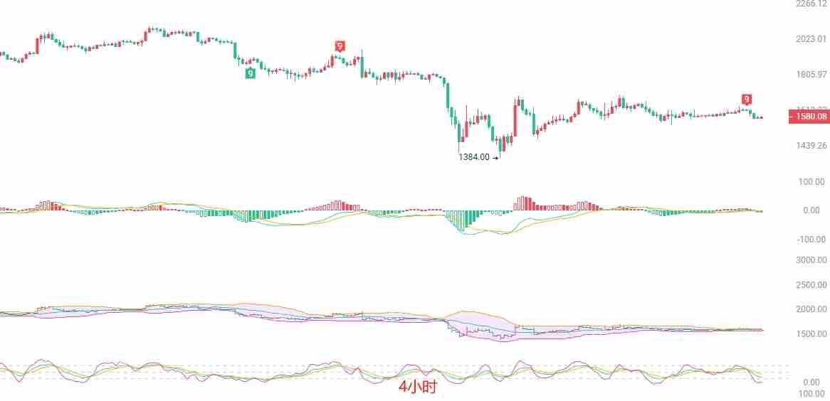 四小时图上,主力呈现出跟跌不跟涨的调性,K线已跌破EMA趋势线,来到低位。MACD放量结束后开始缩量,DIF和DEA形成死叉,K线目前受阻于下轨支撑1565美元,箱体变得更加狭窄,中轨压力位关注1591美元。在这种极窄行情下,操作风险大于收益,建议投资者暂时观望,确保生存后再考虑后续操作,或者等待以太坊破年内最低点后的上车机会,不建议做空。