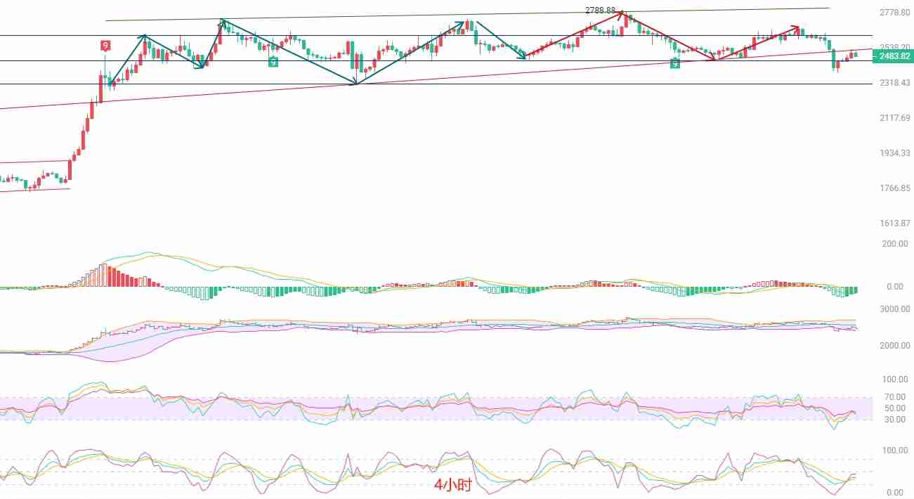 日K线显示,价格最高触及2530美元,最低探至2379美元。价格刚好冲击顶部EMA15趋势快线压力位后回落,表明短期内该压力位依然有效,我们可以考虑南下试仓。重点关注趋势指标密集区2330至2280美元区间的支撑力度。MACD指标持续出现顶部背离,显示出滑坡迹象,缩量增筹。DIF和DEA指标正在靠近0轴线,K线则在布林带下轨支撑2430美元附近横盘整理。短期内,若想冲击布林带中轨2560美元,难度较大。对于南下的朋友,短线止损可以设置在中轨上方。若选择北上,则需密切关注中轨的支撑力度,一旦跌破则需果断获利了结。