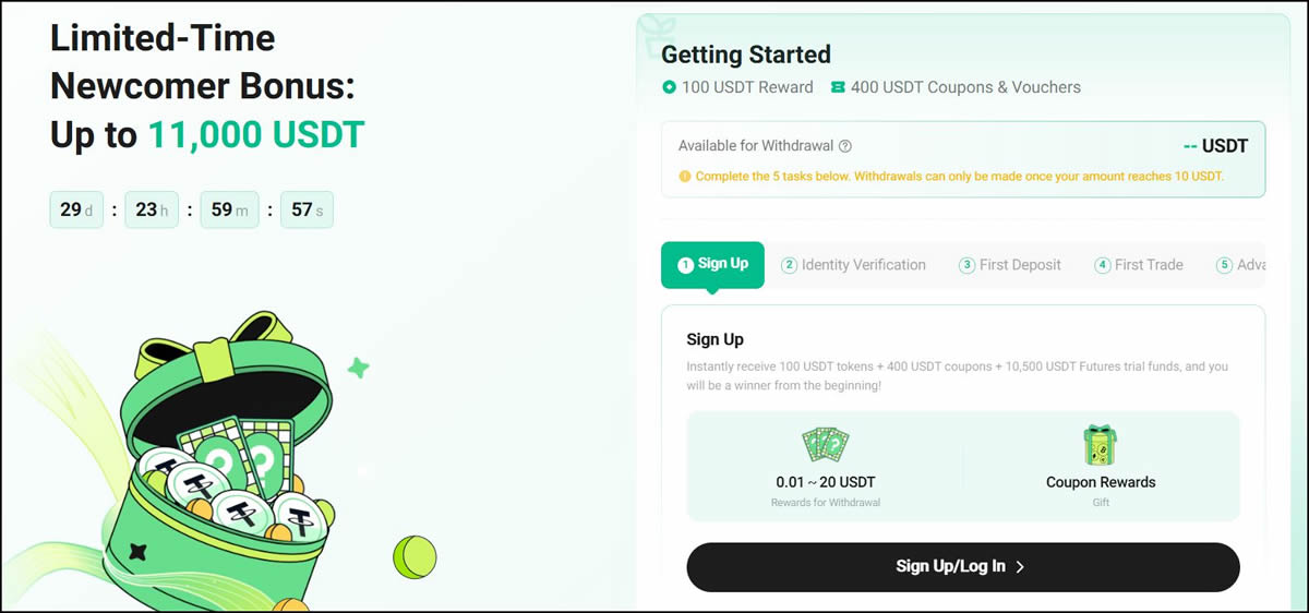 KuCoin 通过其奖励中心为新用户提供高达 11,000 USDT 的注册奖励。注册并完成 KYC 后,您将立即获得:100 USDT 代币、400 USDT 代金券以及 10,500 USDT 期货体验金。