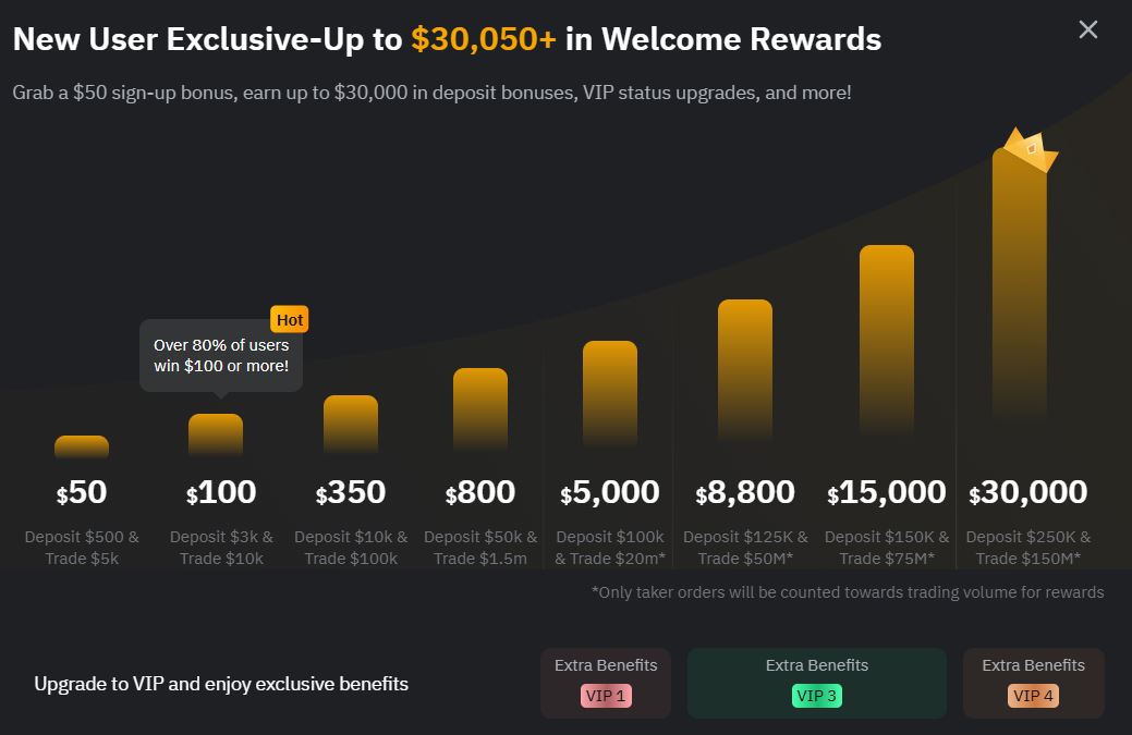 - 高达 6,628 美元的交易量奖金:参与现货或期货交易,根据交易量解锁额外奖励。