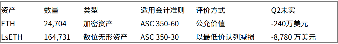 SharpLink持有的多数ETH都放进质押以赚取收益,而根据适用的会计准则不同,在第二季认列了8,780万美元的非现金减损损失。以下是SharpLink基于六月底所持有的ETH和LsETH数量和在会计上不同所造成的差异。