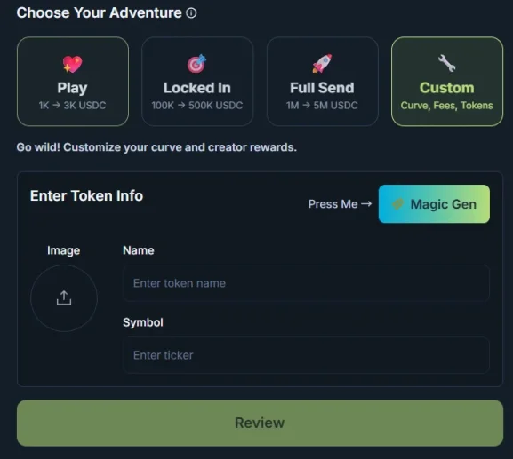 如下图所示,为了简化创建流程,Jupiter Studio 提供了三种预设模式供用户选择,分别是 Play(初始市值为 1000 USDC,达到 3000 USDC 后进入 Meteora 池)、Locked In(初始市值为 10 万 USDC,达到 50 万 USDC 后进入 Meteora 池)、Full Send(初始市值为 100 万 USDC,达到 300 万 USDC 后进入 Meteora 池)。