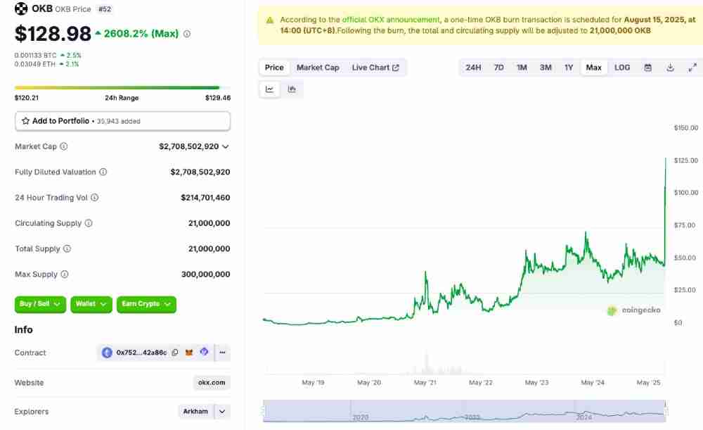 截至2025年8月,供应量已大幅减少至仅 2100万流通OKB ,总供应量也在计划于8月15日进行的销毁后限制在相同数字。这意味着已有超过 2.79亿代币被销毁 ,这在加密行业背景下是一项非凡的通缩举措。