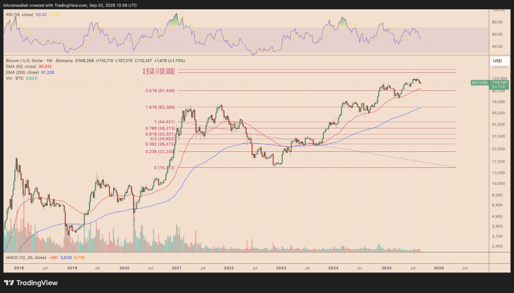 市场分析人士提醒,目前一个不容忽视的关键风险是比特币周线图表上的看跌背离现象:价格创出更高高点,而RSI技术指标却呈下行趋势。