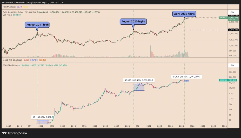 今年4月,当黄金达到3500美元的历史高位时,BTC在接下来的三个月内上涨了约35%。