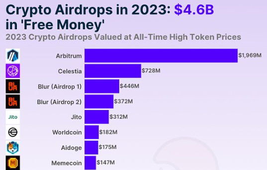2023 年,加密货币空投总价值达到 45.6 亿美元,仅为 2022 年加密货币空投价值的 61.1%。然而,重要的是要考虑到这一时期推出的许多代币对市场来说相对较新。与 2020 年至 2022 年推出的代币不同,这些 2023 年较新的代币尚未经历牛市价格的大幅飙升,例如 2021 年牛市和随后的 2022 年 NFT 牛市。