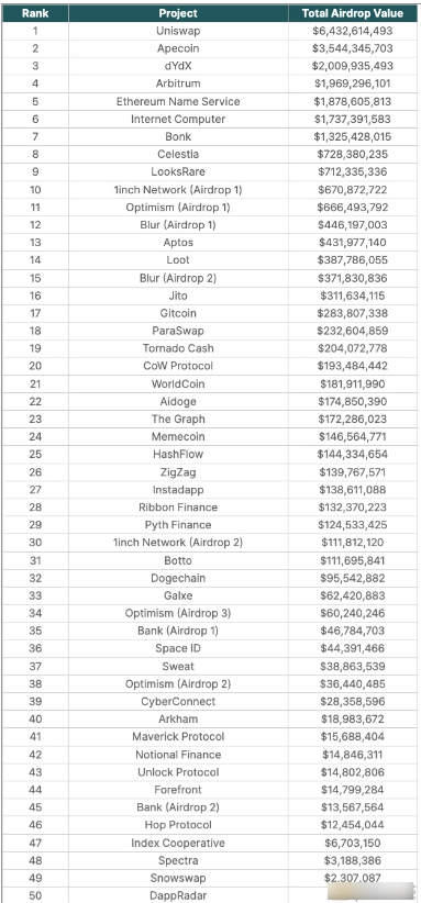 截至 2023 年 12 月 21 日,按代币历史最高价格计算的前 50 大加密货币空投排名如下图(依据公开信息整理):