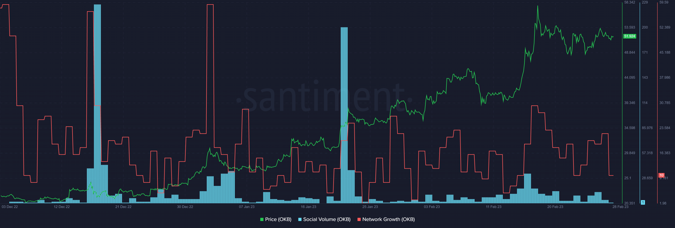 除了价格上涨外,由于网络增长下降,代币似乎并未受到积极影响。指标表明用于传输令牌的新地址更少。尽管价格上涨,但正如社交量指标所表明的那样, OKB的受欢迎程度也有所下降。