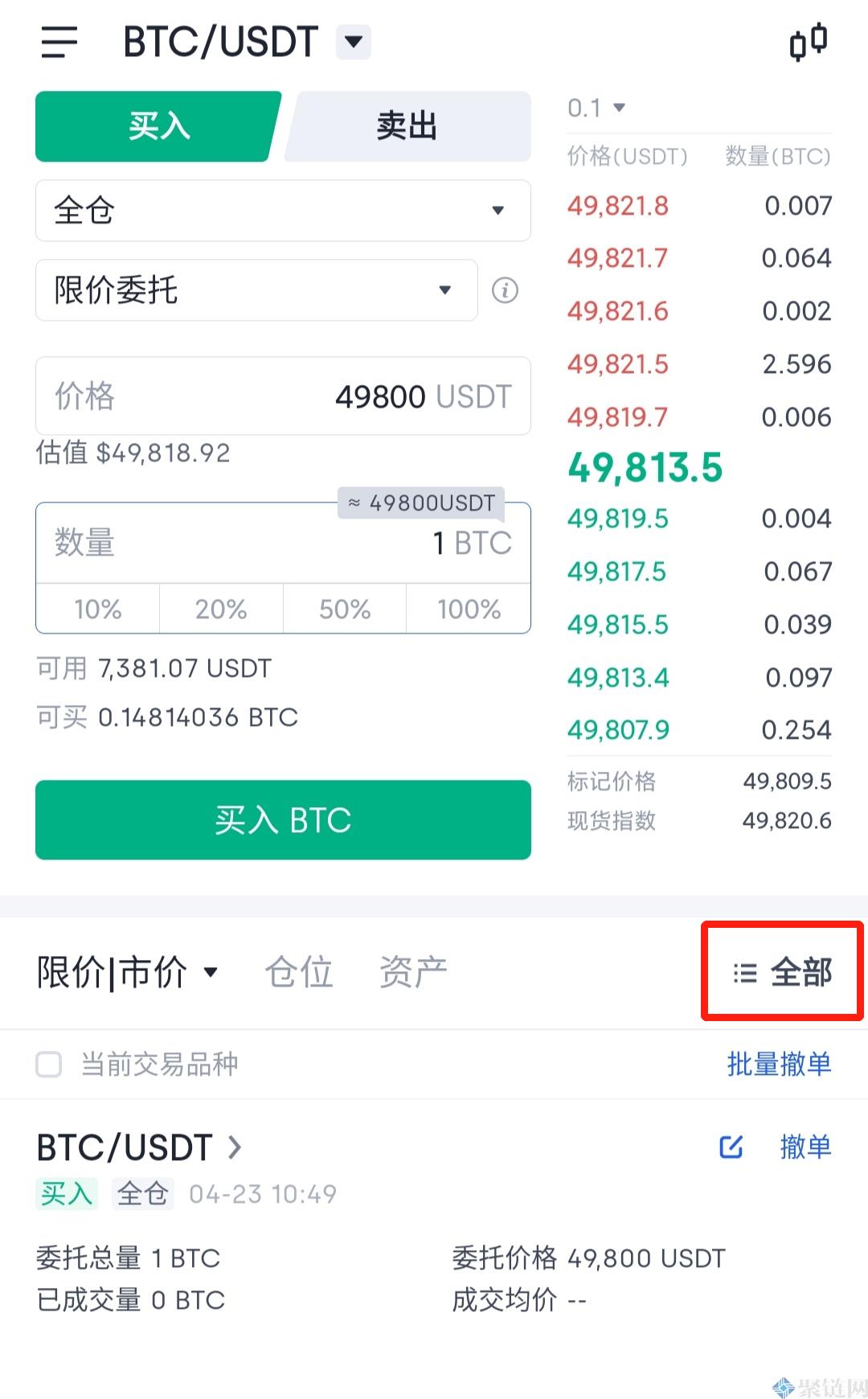 4.点击页面下方的所有按钮,查看您当前的委托和历史委托。您可以在委托表中详细查看订单的委托时间、货币对准和交易量。