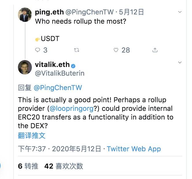 而在近日,Vitalik还提到了一个非常重要的想法:“或许(@loopringorg?)rollup提供商除了运行DEX之外,还能够提供内部的ERC20代币传输服务?”