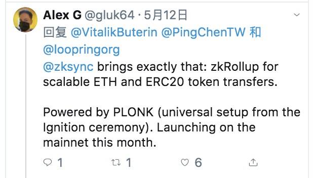 “ZKSync 能够实现这个任务,ZK Rollup可以实现可扩展的ETH和ERC20 代币交易,这是通过PLONK零知识证明方案实现的,我们预计将在本月在以太坊主网上线。”