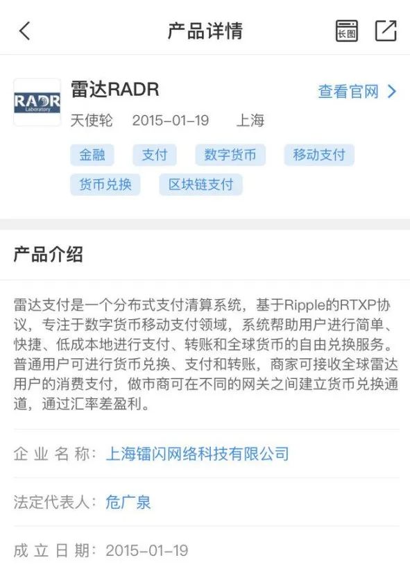 通过企查查查询,与雷达币有关联的公司为上海镭闪网络科技有限公司,该公司成立于2015年1月19日,在产品介绍中,该公司主要介绍了雷达支付,定位同样是基于Ripple的RTXP协议。从基本信息看,该公司与雷达币有所关联,但雷达币是否由该公司所发行尚不得而知。