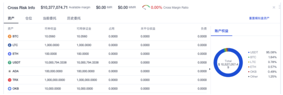 在跨币种保证金模式中,用户可选择全仓或逐仓模式进行交易,交易账户中的资产展示如下图所示: