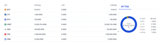 在单币种保证金模式中,用户可选择全仓或逐仓模式进行交易,交易账户中的资产展示如下图所示: