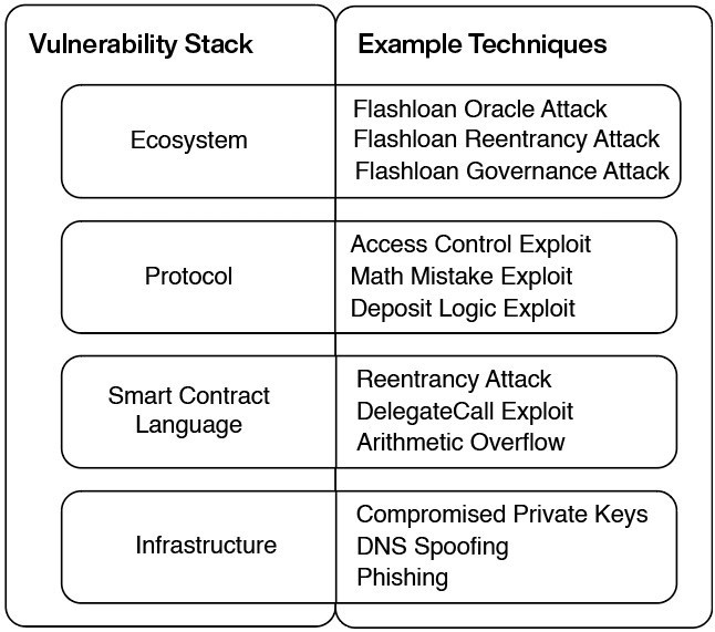 加密应用生态系统由互操作协议组成,由智能合约支持,依赖于链和互联网的底层基础设施。此堆栈的每一层都有其独有的漏洞。我们可以根据利用的堆栈层和使用的方法对加密黑客进行分类。