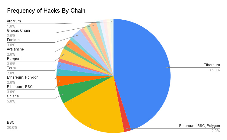 根据失窃的合约或钱包所在的链对数据集进行分析。以太坊的黑客数量最多,占样本组的 45%。BIAN 智能链(BSC)以 20% 的份额位居第二。
