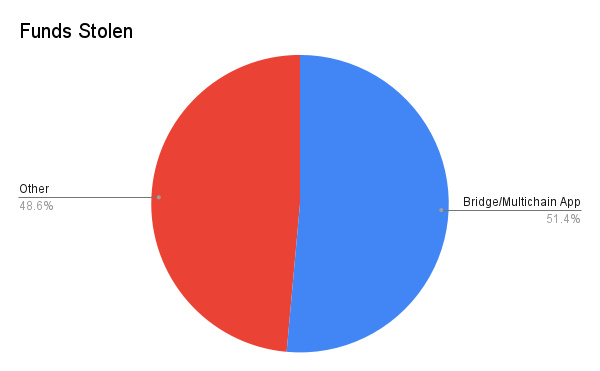 涉及跨链桥或多链应用程序(例如多链交易或多链借贷)对数据集产生了巨大的影响。尽管这些黑客事件只占总数的 10%,但却窃取了 25.2 亿美元的资金。