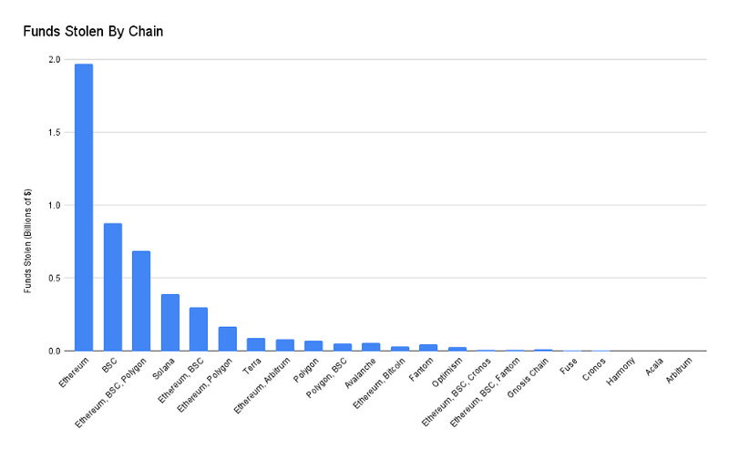以太坊的被盗资金最多(20 亿美元)。BSC 位居第二(8.78 亿美元)。