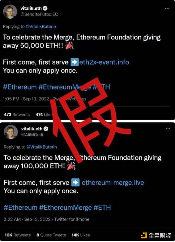 围绕以太坊合并这一热点事件,已经有骗子在使用加 V 的推特账户冒充以太坊联合创始人 Vitalik Buterin,宣传虚假的 ETH 空投,诱导网友访问诈骗者的加密钱包,这些地址很可能涉及钓鱼欺诈,需要投资者谨慎识别。