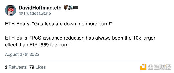 谁会对低 gas 价格不满意?减少发行量一直是最重要的,销毁只是锦上添花。这种影响就是为什么一些 ETH 多头预计合并对 ETH 价格的影响会相对较快:是几个月而不是几年。