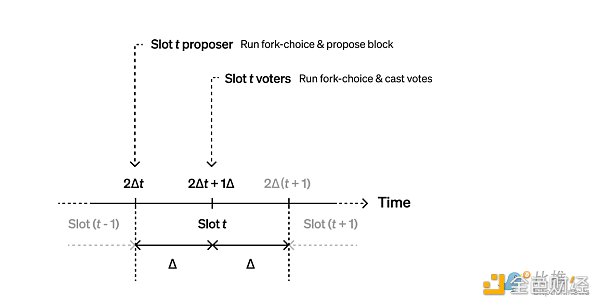 在每个slot的开始,slot的提议者根据前一个 slot 的投票运行简单的 GHOST 分叉选择规则,以确定在哪里提议一个块。进入slot的三分之一时,该时段的委员会成员使用相同的分叉选择规则,该规则基于前一个时段的投票和提议者转发的投票,来确定在哪里投票。 最后,在进入slot的三分之二时,所有验证者都运行一个明确定义的 T 深度确认规则。