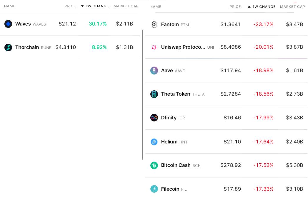 前 80 位硬币中的每周赢家和输家。资料来源:经济学